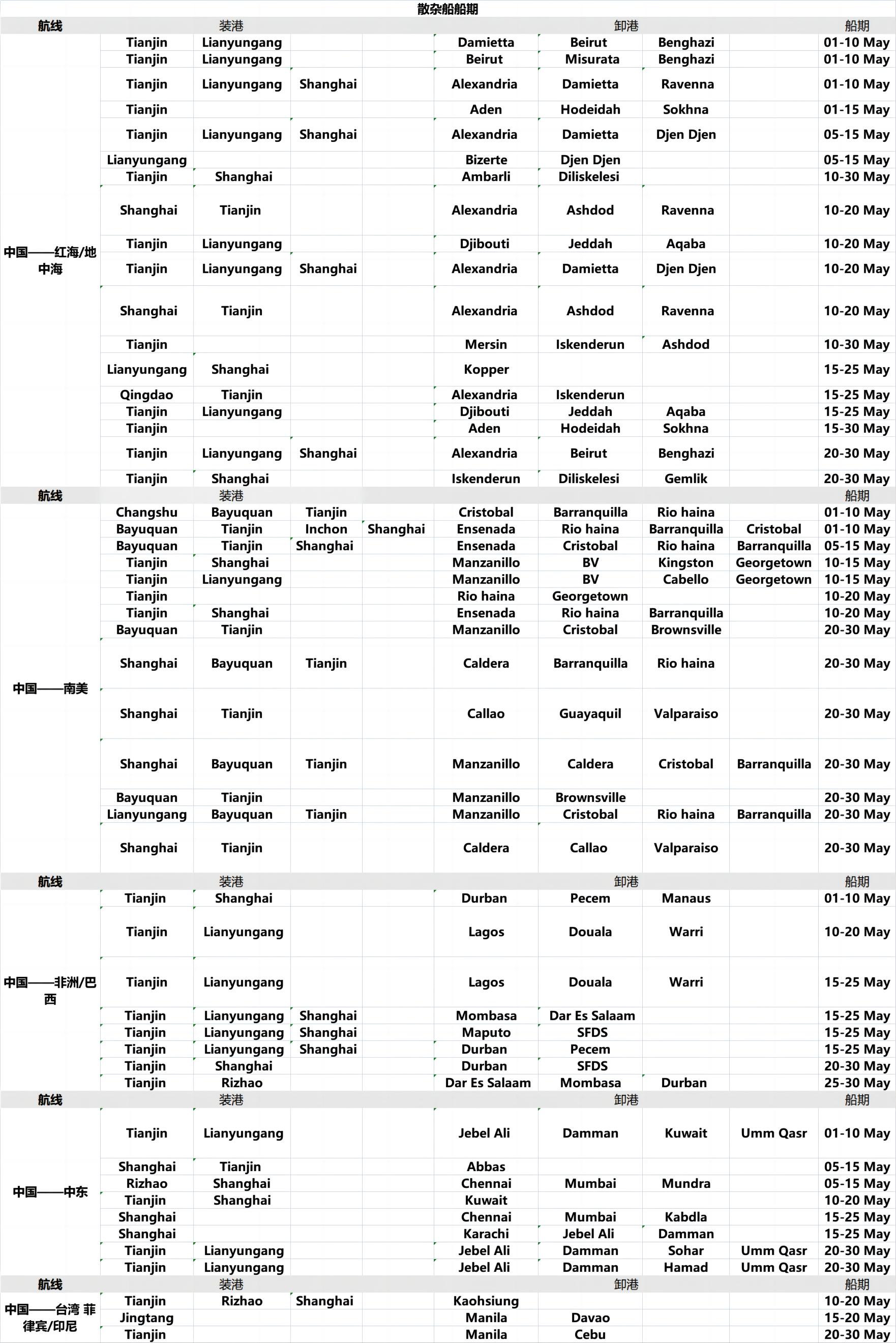 散杂船船期不定期更新