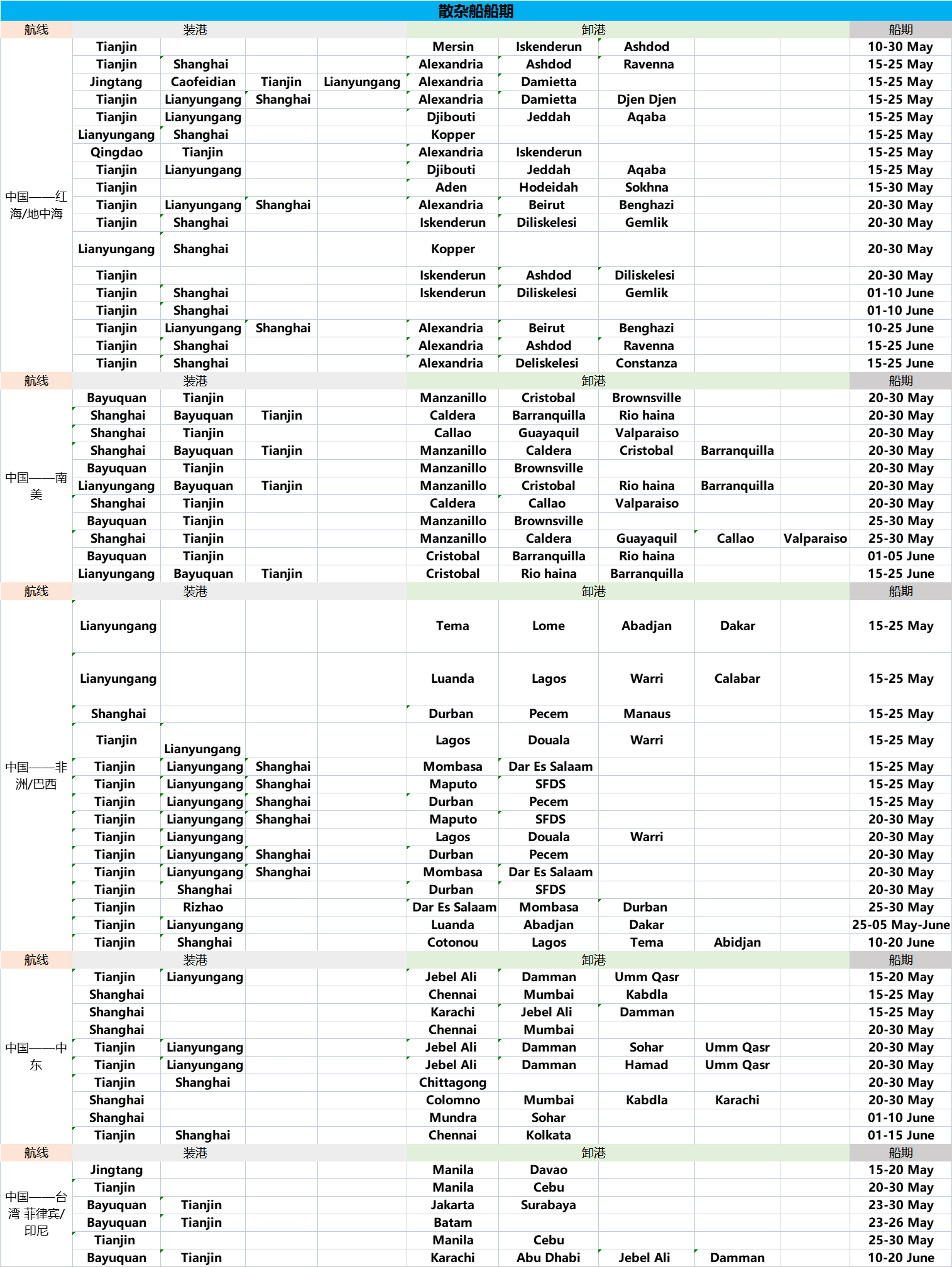 散杂货船期不定期更新