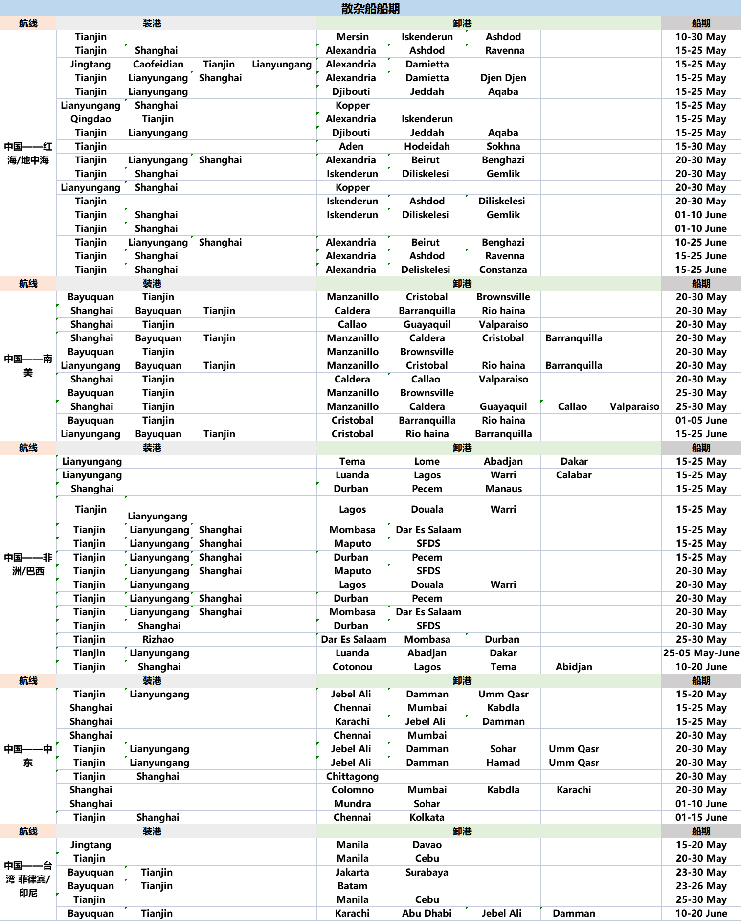 散杂货船期不定期更新